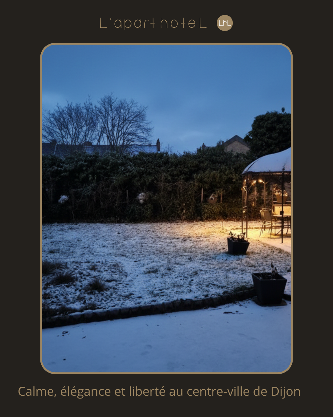 Under the snow, our garden becomes a silent refuge, almost unreal. Evening lights cast delicate shadows, time seems to stand still… A rare moment to savor in the heart of Dijon 🤍